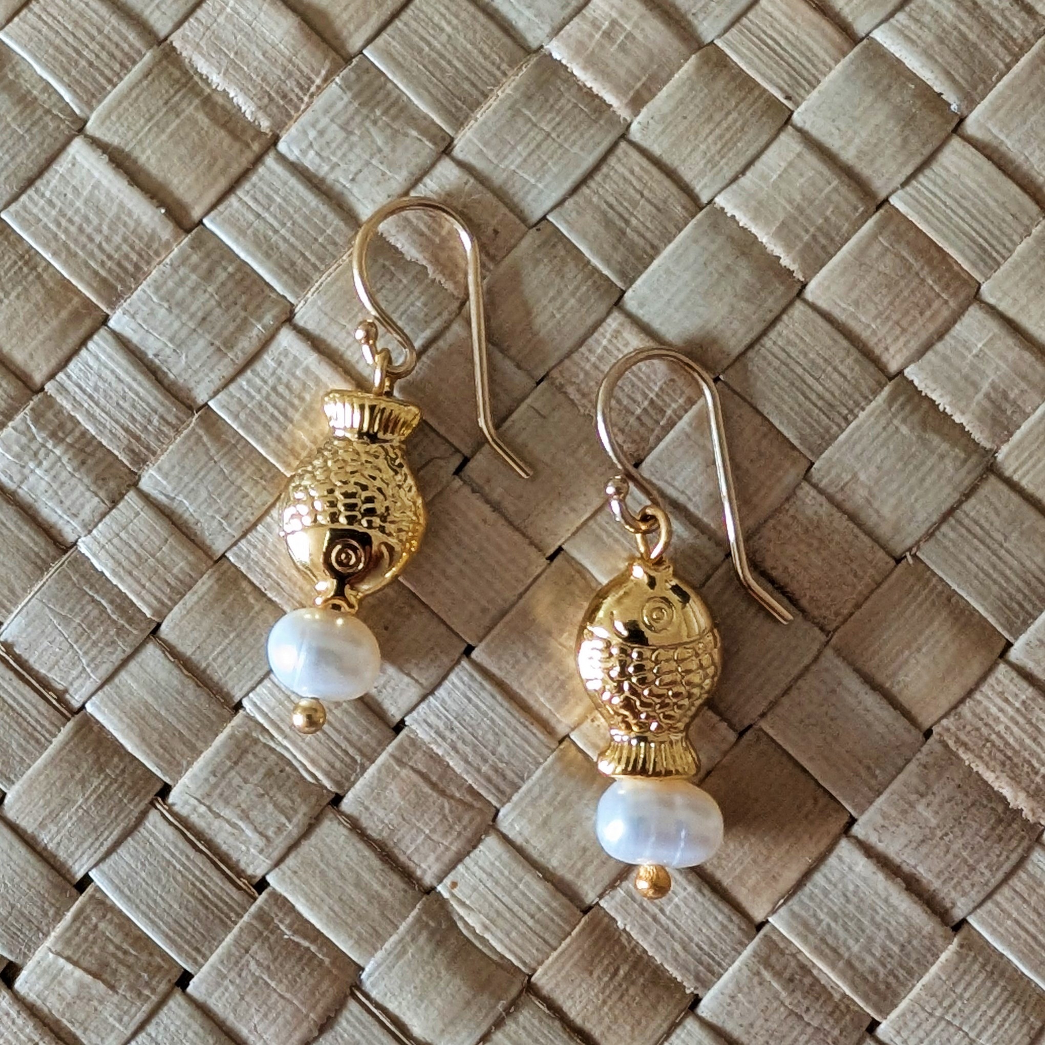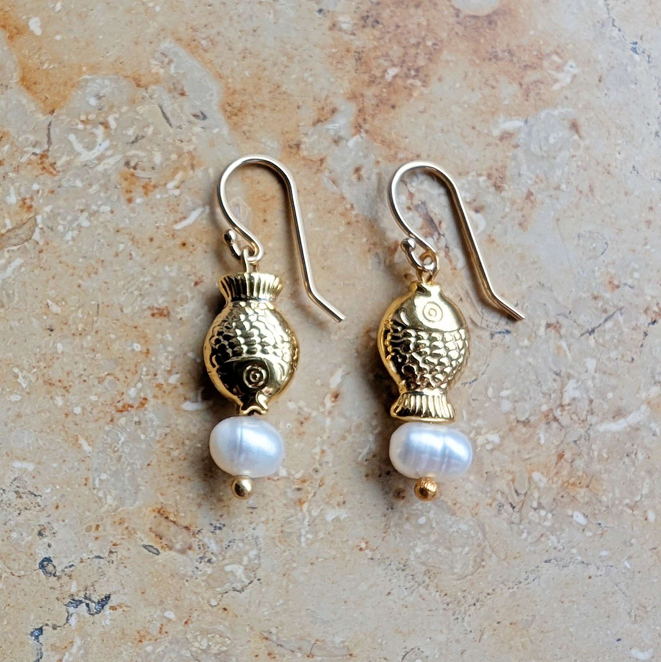 Material: Fischanhänger goldplated, Basis Messing | Süßwasserperle | Ohrhaken 925 Silber, 24k vergoldet